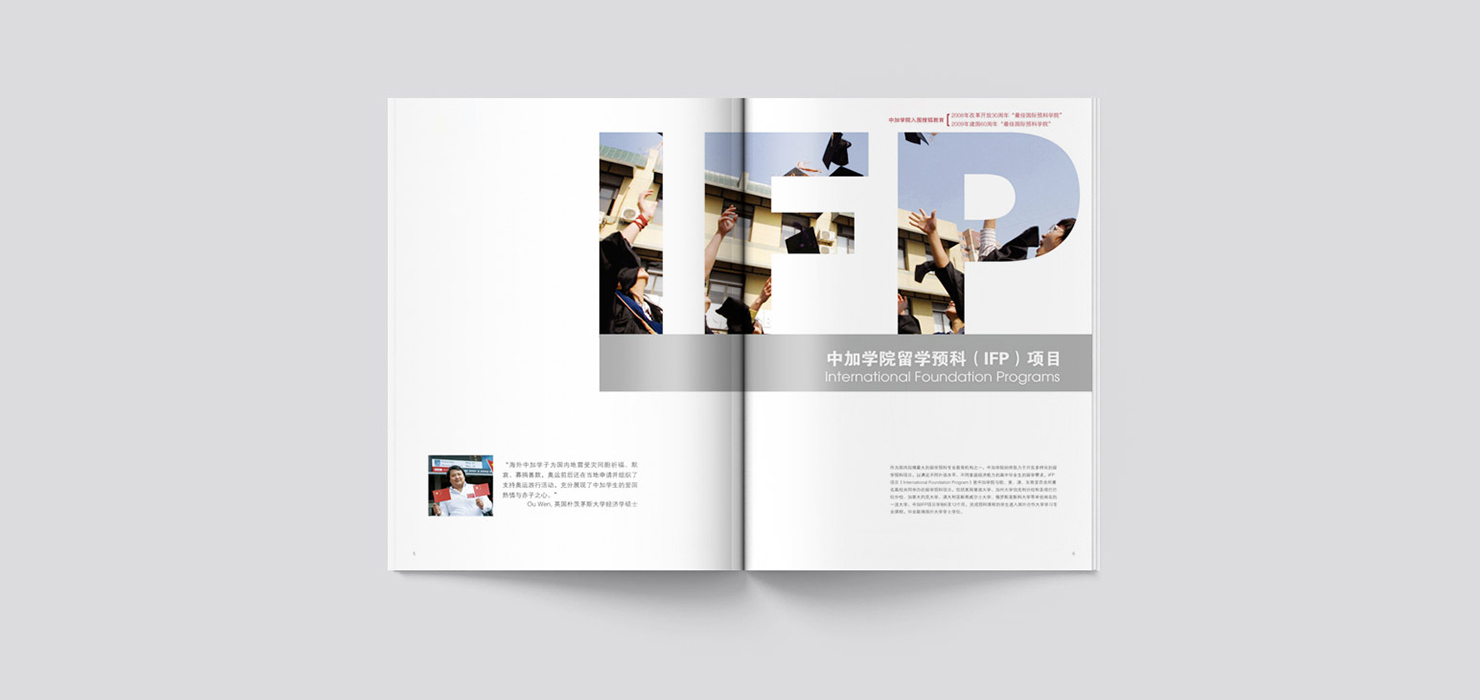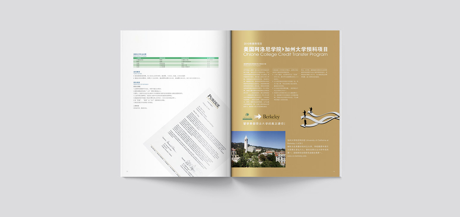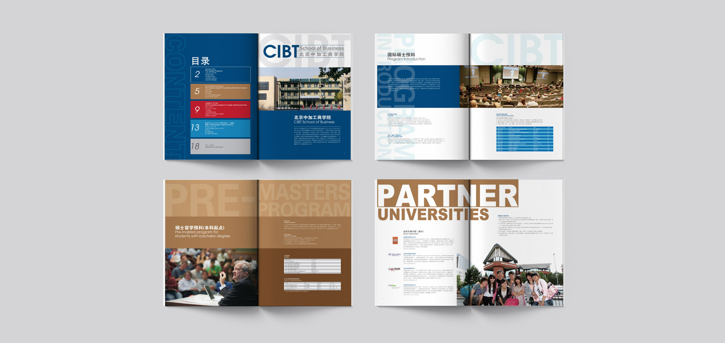 北京中加工商学院由北京工业大学和加拿大商业科技学院于1995年共同创办的中外合作学院。自2000年开始与美国、英国、荷兰、加拿大、澳大利亚、新西兰等国家的多所著名公立大学合作举办留学英语培训学分置换项目,是国内此类项目开展最早、规模最大的学院之一。 项目设计:画册设计、招生手册设计、折页设计、广告设计、DM单设计、其它