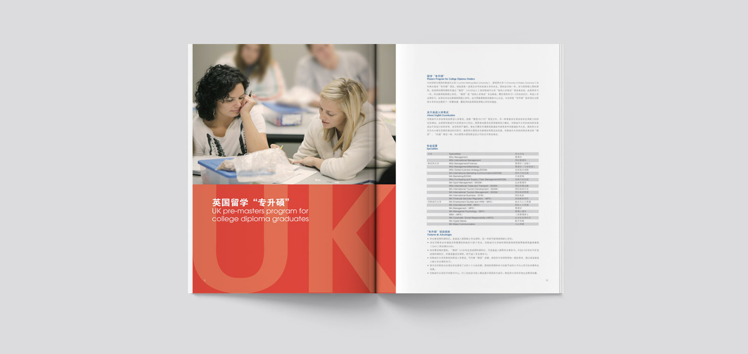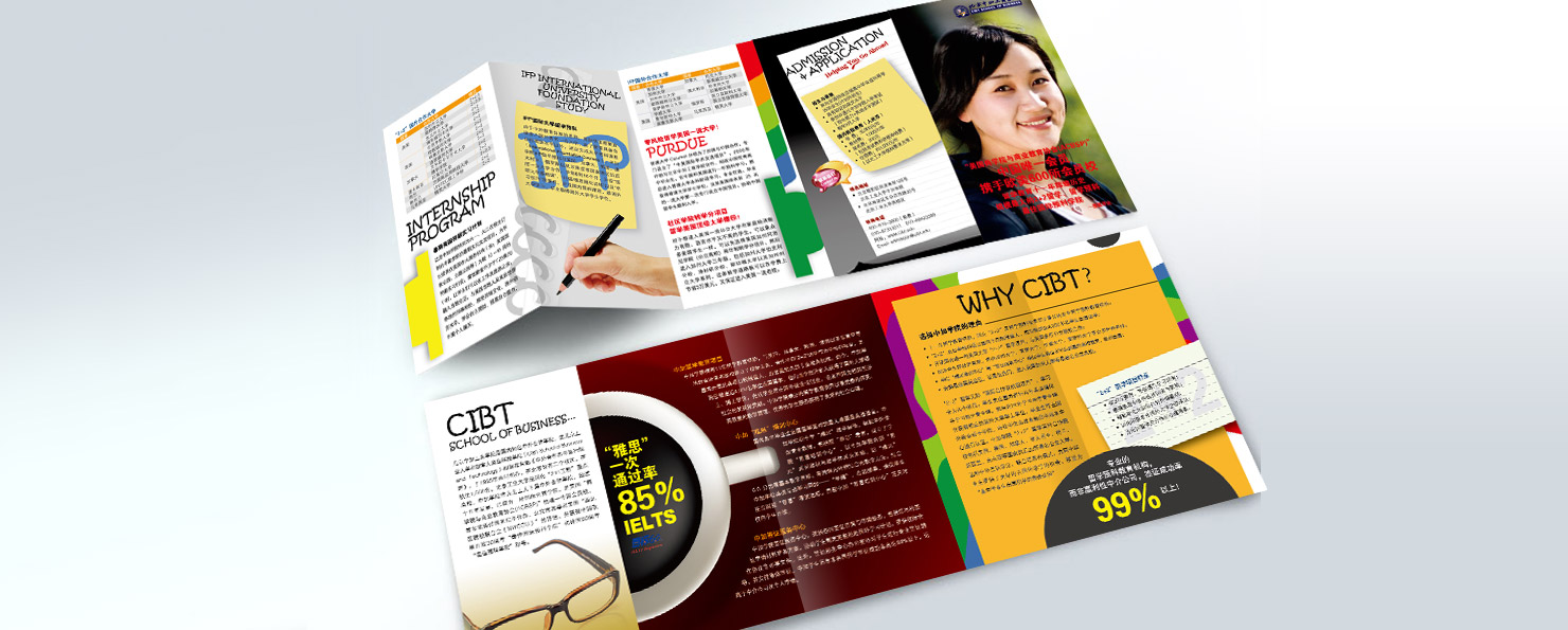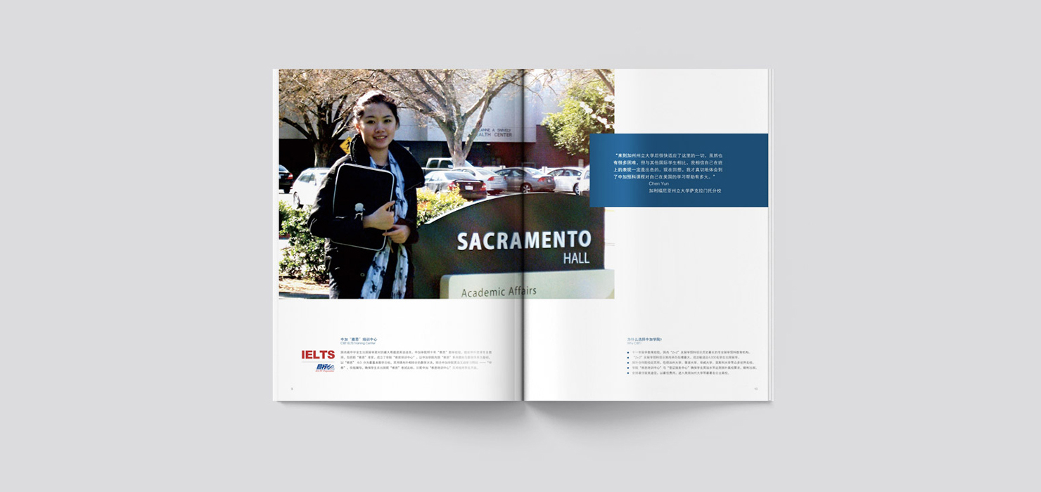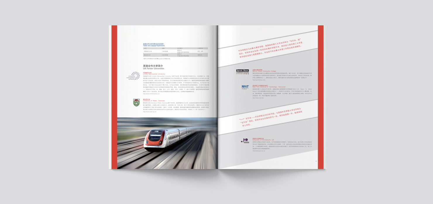 北京中加工商学院由北京工业大学和加拿大商业科技学院于1995年共同创办的中外合作学院。自2000年开始与美国、英国、荷兰、加拿大、澳大利亚、新西兰等国家的多所著名公立大学合作举办留学英语培训学分置换项目,是国内此类项目开展最早、规模最大的学院之一。 项目设计:画册设计、招生手册设计、折页设计、广告设计、DM单设计、其它